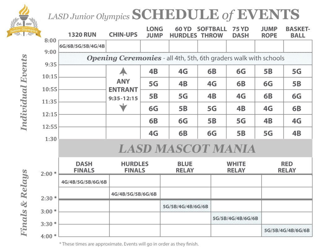 The Junior Olympics is an annual event that brings together the seven LASD elementary schools for a friendly track & field competition, in which everyone is encouraged to strive for their personal best and cheer on their classmates as they compete.